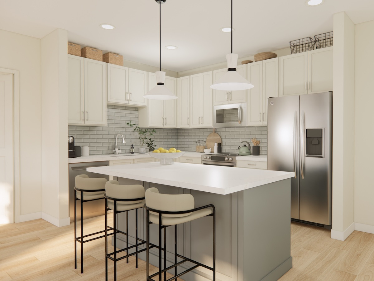 - Open kitchens with island or peninsula seating and hanging pendent lights